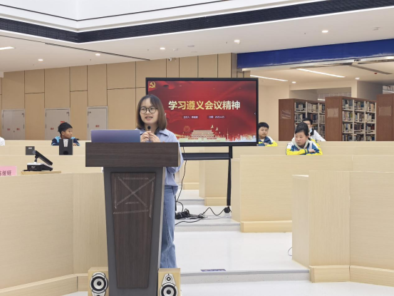 洋塘小学教师代表罗瑶瑶希望小学生们在本次活动中用眼睛去发现、用耳朵去倾听、用心灵去感受,让红色知识带领大家遨游在贵州医科大学图书馆知识的海洋。马克思主义学院教师陈娅娅开展了《学习遵义会议精神》主题教育。希望大小学生们通过感悟遵义会议精神,以史为鉴、开创未来,从长征精神和遵义会议精神中深刻感悟共产党人的初心和使命,传承红色基因、赓续红色血脉!课后大小学生们交流本次学习心得。